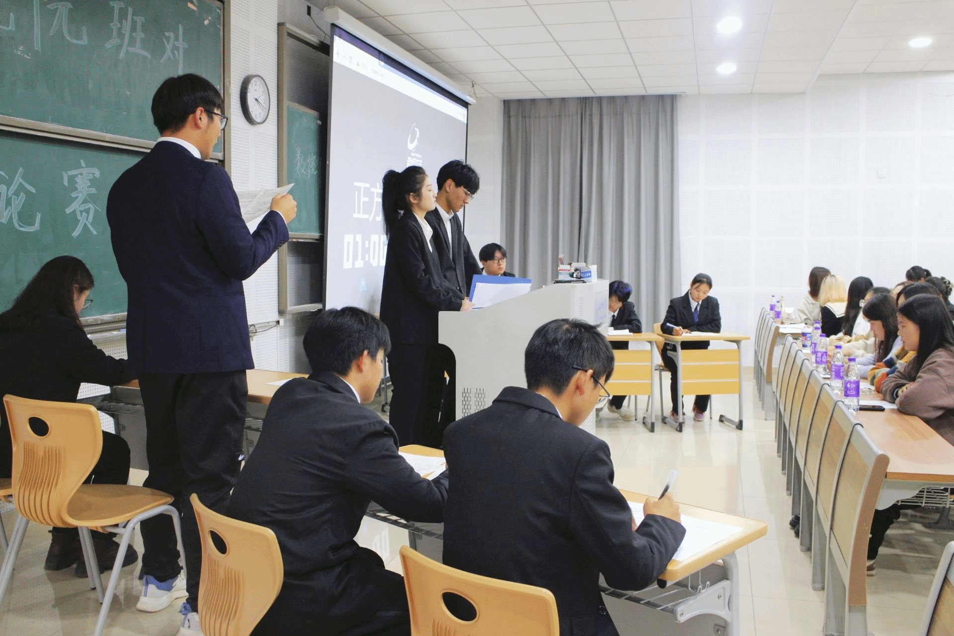 11月22日下午,班对班辩论赛决赛在博学楼D101举行,2023级辅导员刘全亚和员工会各部门部长们担任评委,2023级全体员工观看了此次比赛。