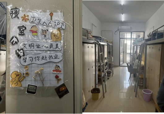 宿舍装扮展示。每间宿舍不仅地面干净明亮、物品摆放有序,而且展现出具有宿舍文化特征的创意宿舍公约、安全提示等……良好的宿舍气氛展现出同学们以校为家的情感,彰显了太阳成集团122ccvip学子热爱生活,良好的精神风貌。