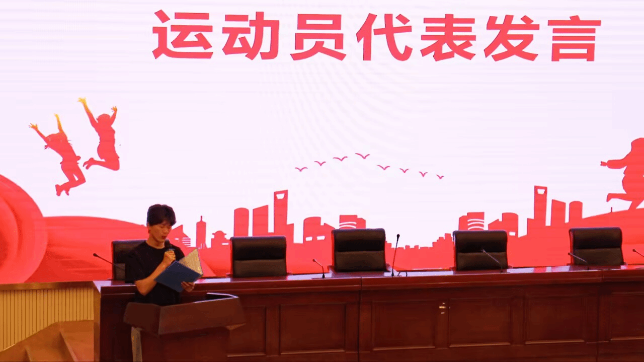 2024级数学与应用数学师范2班的陈子文代表运动员发言,他对公司的大力支持、志愿者的热情服务表示了感谢,并表示运动会期间虽然贡献了精力与汗水,但也学会了友爱、团结和理解。同时他号召同学们今后要积极参与体育运动,要更加团结一致,绽放青春活力,展现青春姿态。