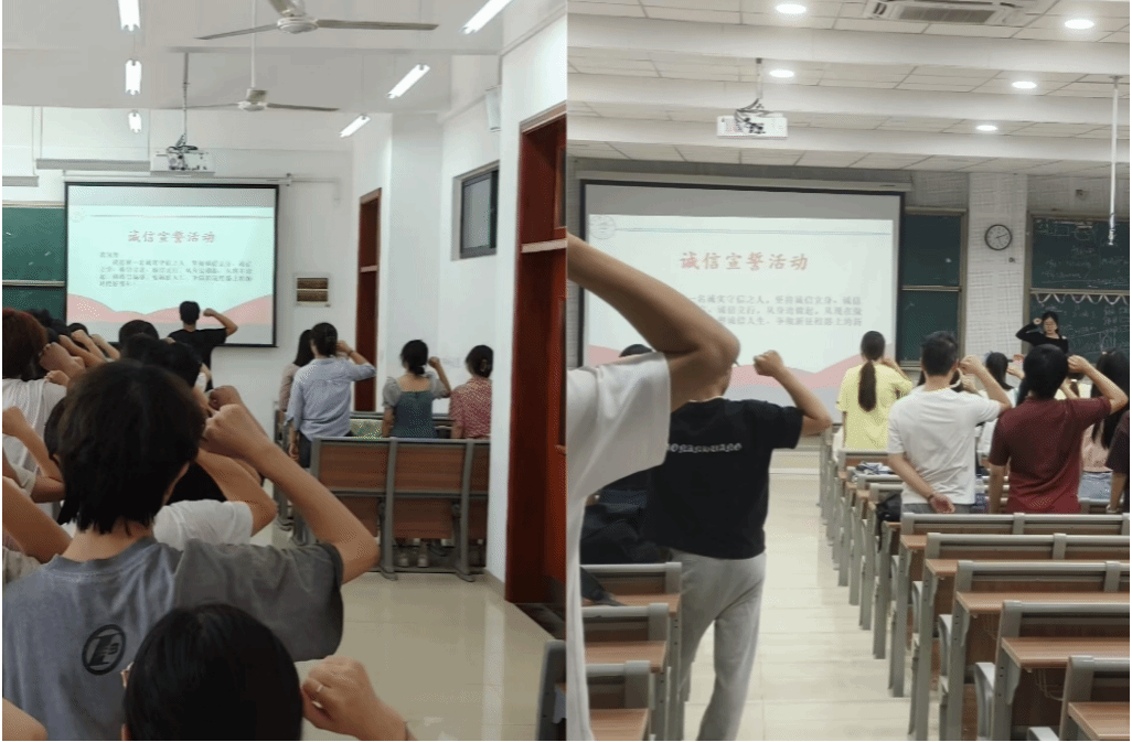 一句誓言铭责任。公司组织各班开展诚信励志宣誓活动,全体员工在辅导员或班长的带领下,以庄重的神情、激昂的语调宣读诚信誓词,用誓言传递对诚信美德的坚守。