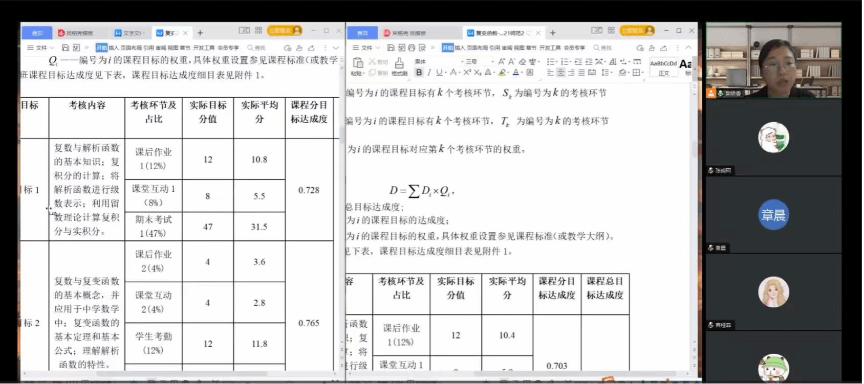 为扎实推进教学管理,提升教学质量,全面了解教学情况,太阳成集团122ccvip于9月26日、10月9日、10日、11日分别对数学与应用数学专业课程目标达成情况召开线上、线下会议(博约楼312)。数学与应用数学专业2022-2023学年第二学期授课教师栾庆芳、沈春芳、樊晓香、王宁等对课程目标达成情况进行分析反馈。