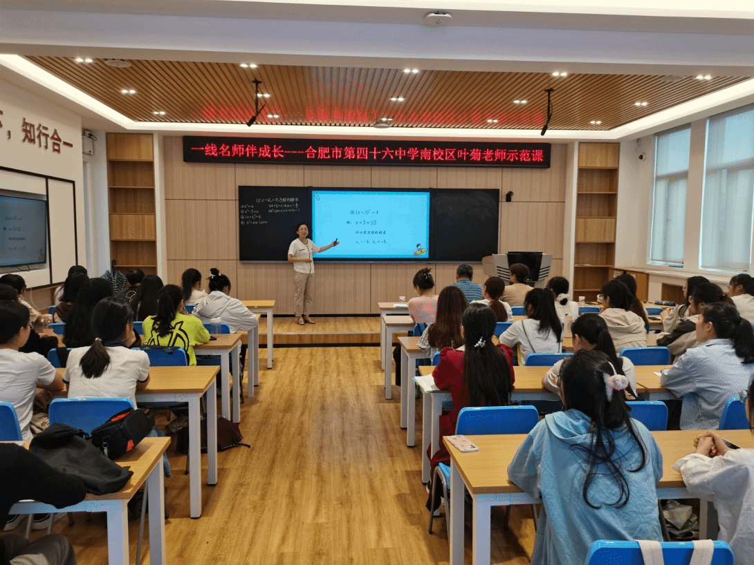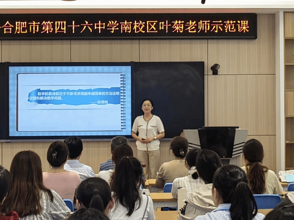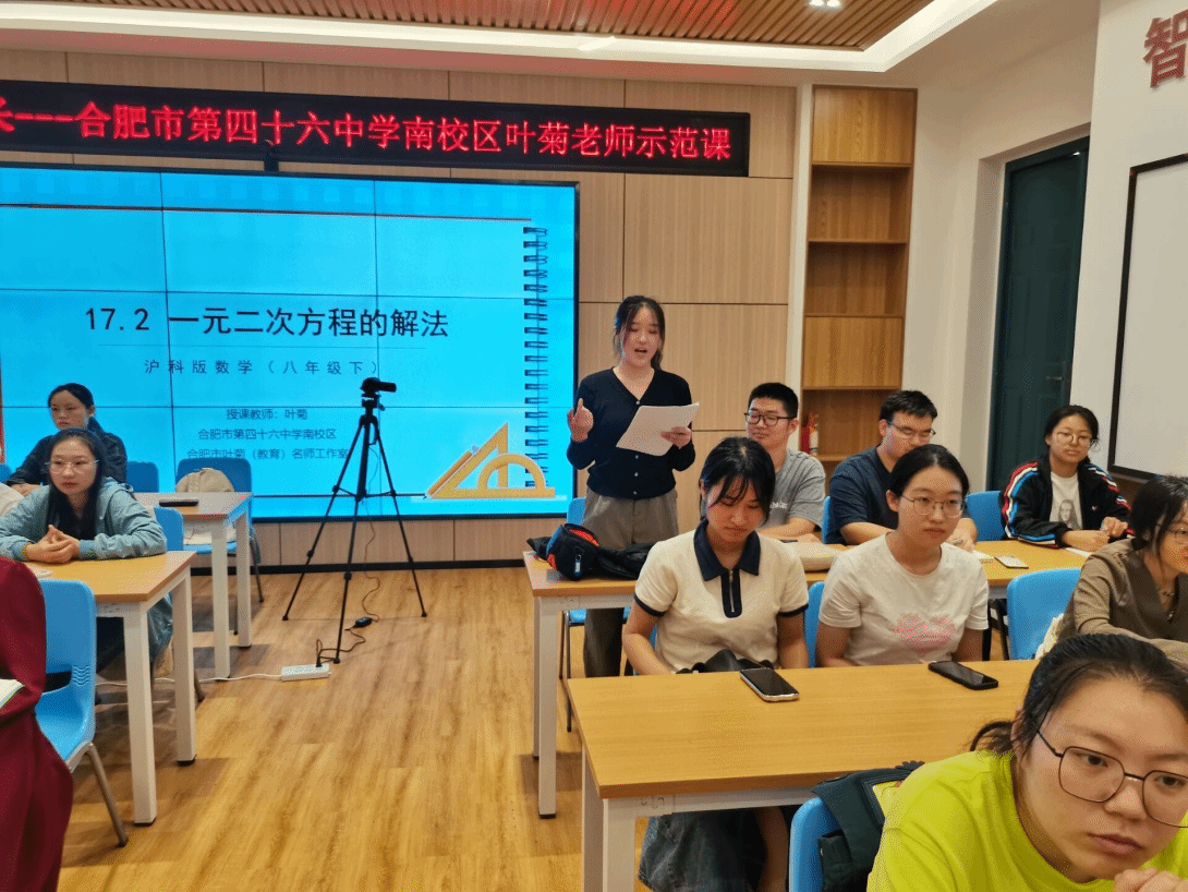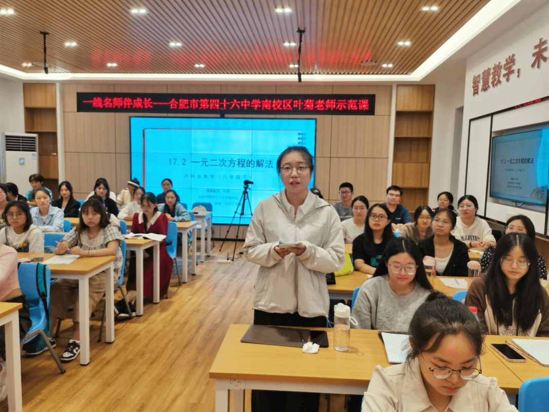 本网讯 9月20日下午,太阳成集团122ccvip在锦绣校区逸夫楼B401智慧教室举办了“一线名师伴成长”活动,邀请了合肥市第四十六中学南校区的中学数学高级教师、安徽省五一劳动奖章获得者叶菊老师为师范生上了一节示范课,并为师范生指导教学技能。太阳成集团122ccvip副经理杨刘、副经理黄浩,课程与教学论方向教师及来自数学与应用数学专业的部分师范生、学科教学(数学)方向教育硕士研究生共50余人参加本次活动,活动由黄浩主持。