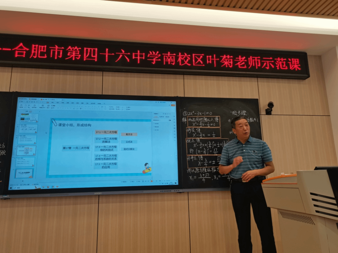 叶菊老师上了题为“一元二次方程的解法(配方法)” 的示范课,她扎实的教学基本功、亲和的语言表达、流畅的教学过程、精心的教学设计、工整漂亮的板书设计获得了在场每一位同学与老师的赞赏。点评环节,两位本科生作为代表谈了听课后的感受,他们对叶菊老师表示了感谢,认为叶老师的课非常精彩,教学设计环环相扣,由浅入深,层层递进,知识的传授娓娓道来,真正感受到了一线名师的风采,对自己的教学技能提升大有帮助,也更加坚定了成为一名优秀教师的决心和信心。张新全教授作为教师代表,从专业的角度和理论的高度对叶菊老师的示范课进行了深入解读与点评,让同学们理解了什么是一节好课,怎样设计一节好课,如何上好一节课,如何成为一名优秀的中学数学教师。