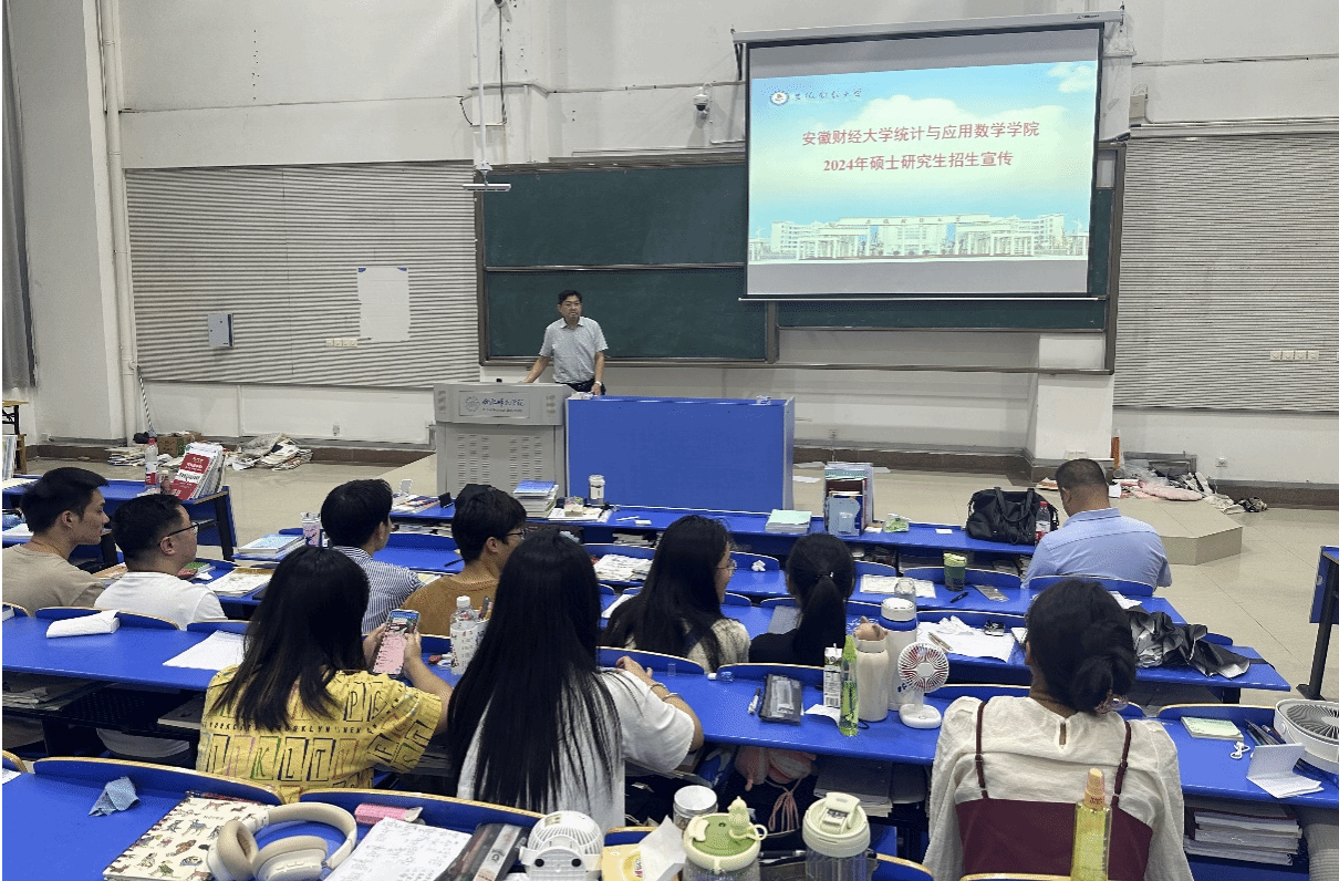 本网讯 9月15日,在逸夫楼西阶1教室,安徽财经大学统计与应用数学公司教授孙欣和李旭辉、副教授李琴和张伟一行来太阳成集团122ccvip开展研究生招生宣传。公司副经理杨刘、统计系主任杨海蓉、教师宋雅晴接待并出席宣讲会。公司数学与应用数学、经济统计学、应用统计学、金融工程专业100余名高年级员工参加。