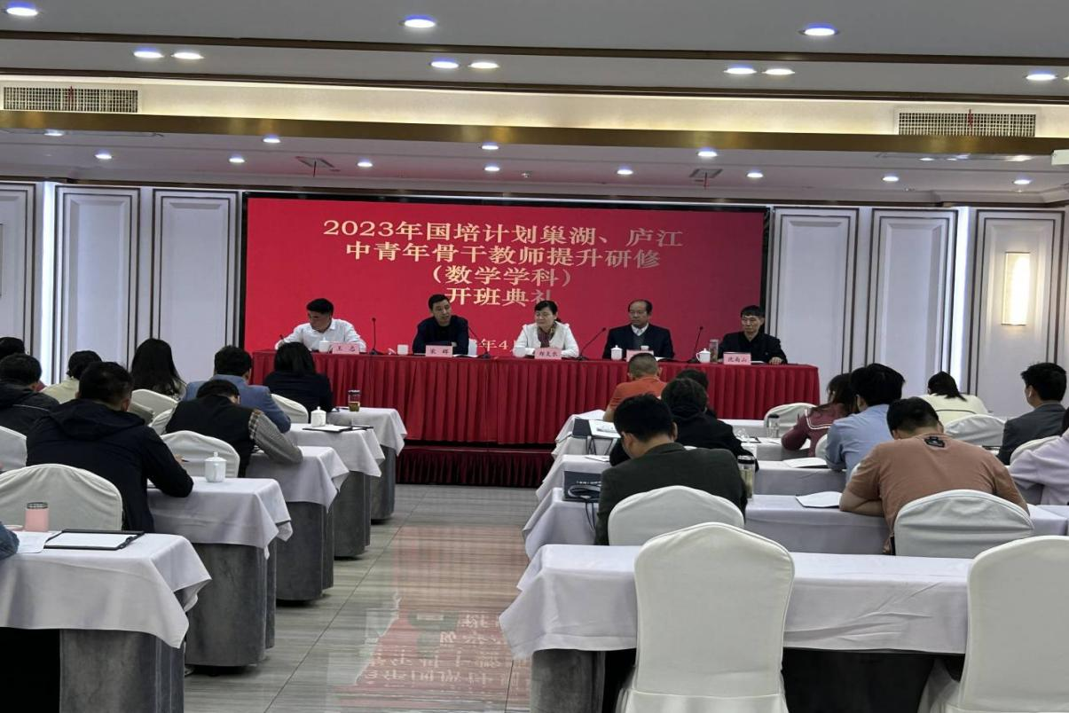 本网讯 4月22日上午,由太阳成集团122ccvip承办的巢湖市、庐江县2023年“国培计划”中青年骨干教师提升研修(数学学科)在源牌国际大酒店举行开班仪式。公司党委书记郑支农、经理王家正、继续教育公司副经理宋辉、太阳成集团122ccvip国培项目执行人沈南山出席了本次开班仪式。来自巢湖市、庐江县的36位参培学员参加了开班仪式。开班仪式由班主任王志主持。