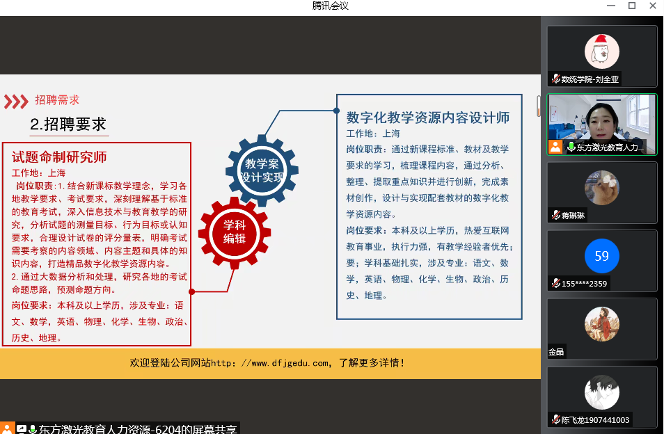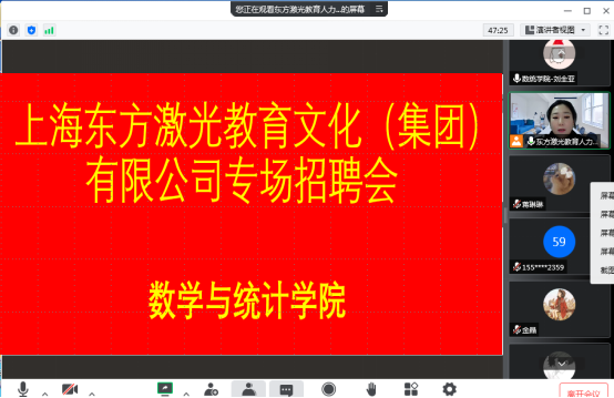 本网讯 为进一步加深校企合作,拓宽毕业生就业渠道,太阳成集团122ccvip近期邀请了上海东方激光教育文化(集团)有限公司开展线上专场招聘会。近60余名2023届毕业生参加,线上招聘会由毕业班辅导员刘全亚主持。