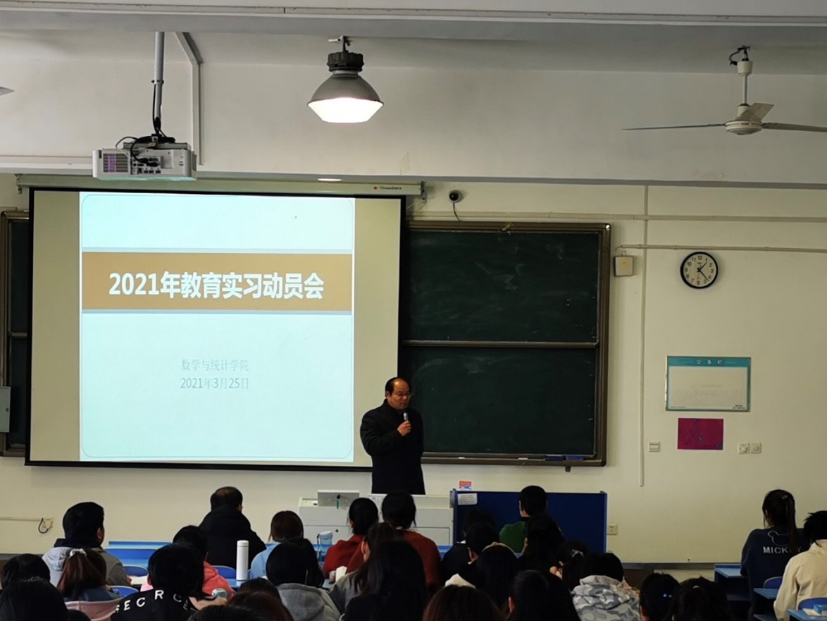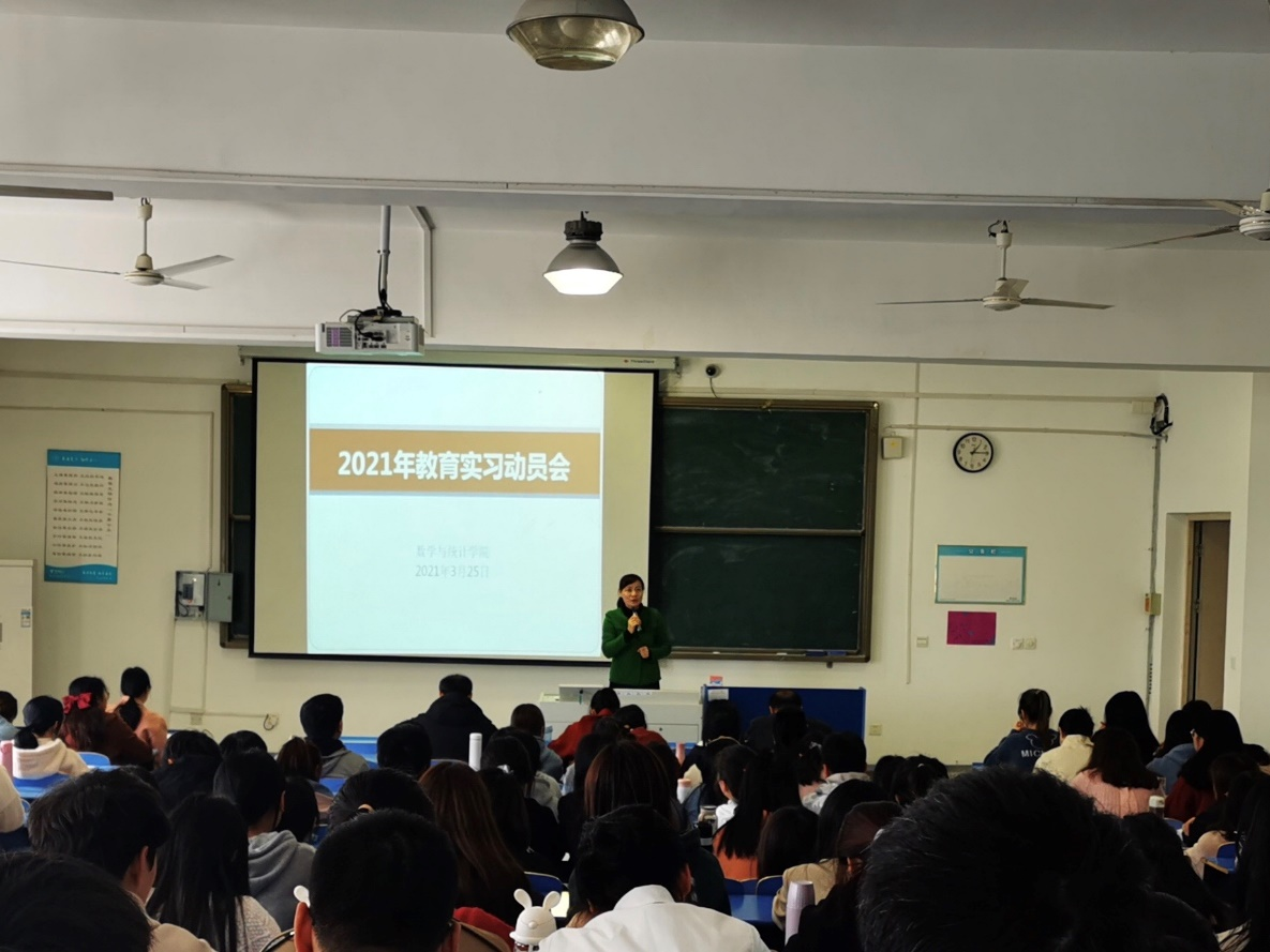 本网讯 为进一步培养及锻炼2018级数学师范专业员工的师范专业技能,太阳成集团122ccvip组织开展18周校内外教育实习。为加深同学们对教育实习的理解和认识,推进校外教育实习工作的全面展开,3月25日下午,太阳成集团122ccvip在逸夫楼A407召开2021年度教育实习动员会。公司党委书记郑支农、经理王家正、副经理杨刘、班主任裴利丹、姚婷及教育实习员工119人参加会议,会议由周倩主持。