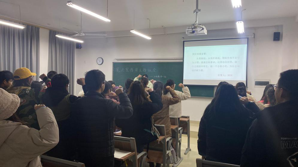 此次主题班会主要围绕深入学习习近平法治思想、学习宪法知识等内容开展。各班班长首先强调了宪法在我国政治、经济、社会生活中的重要地位,宪法是国家的根本大法,它规定了国家的根本制度和根本任务,是国家统一、民族团结、社会稳定的基础,是公民权利的根本法律保障,是实现我国社会主义法制统一的基础,是依法治国的基本依据,是治国安邦的总章程。随后,向同学们普及了宪法相关知识,增加同学们对宪法的了解。