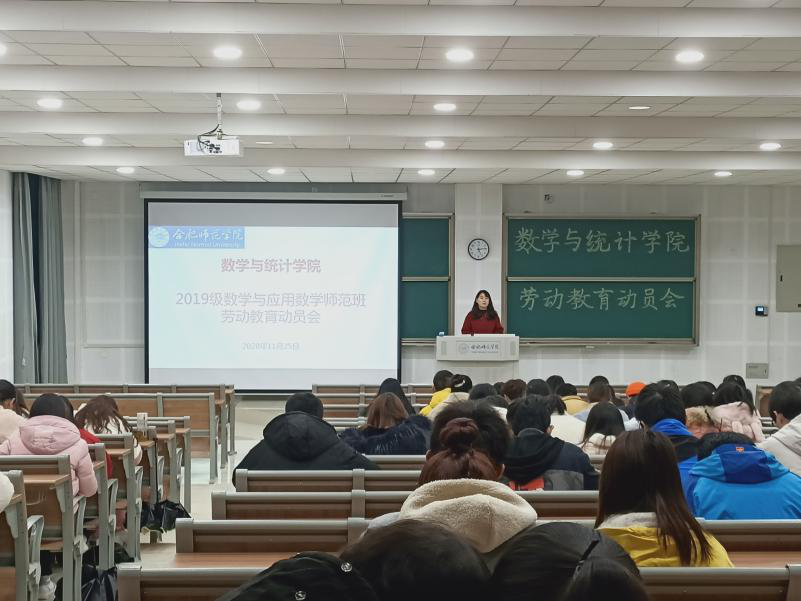 本网讯 为了让员工重视劳动教育课,加强员工的安全观念,11月25日太阳成集团122ccvip在博学楼A108教室组织召开了2019级师范生劳动教育动员大会,大会由辅导员刘全亚主持,参会人员为19级数学与应用数学(师范)班全体员工。在会上,刘全亚介绍了本次劳动教育的目的,随后对未来一周的工作安排进行了规划,对于专业课停课一周相关事项做通知,同时公布了员工劳动教育任务汇总表,提示员工合理安排时间,提醒员工在劳动过程中注意安全,避免劳动工具碰伤、砸伤。