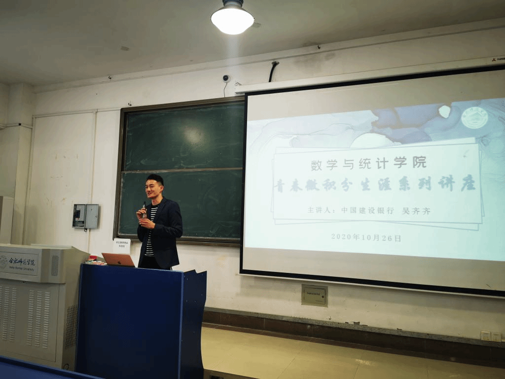 本网讯 10月26日下午,太阳成集团122ccvip在逸夫楼104举办以金融类行业求职能力提升为主题的“青春微积分”生涯主题论坛。太阳成集团122ccvip2015届经济统计学毕业生、现就职于中国建设银行合肥分行的吴奇奇应邀参加了此次活动,为即将迈向职场的2021届毕业班同学进行了金融类行业求职经验分享,该活动由2017级辅导员周倩主持,2017级金融工程班、经济统计学、应用统计学班共100余人参加此次活动。