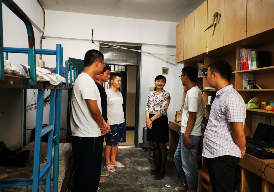 下午,数统公司党委书记郑支农一行前往新生宿舍,慰问了刚刚入住宿舍的新生们。她亲切地询问了同学们对新环境是否适应,询问同学们的需求,提醒新生注意疫情防控、注意防盗防骗,并向新生讲解了如何解决宿舍中一些常见的问题。