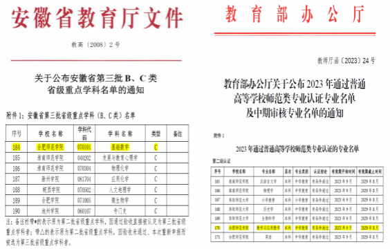 专业特色:本专业办学历史可追溯至1955年,学科优势明显,师范特色鲜明。“基础数学”是省级重点学科。专业先后获批省级特色专业、安徽省应用型高水平大学重点建设专业、省“六卓越、一拔尖”人才培养专业、省级一流专业建设点、省一流本科人才示范引领基地等,是教育部首批“国培计划”示范性项目培训单位。2023年,本专业通过教育部师范专业二级认证。