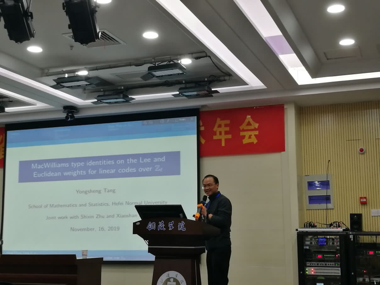 本次会议由安徽省数学会主办,铜陵公司承办,会议吸引了包括来自中国科学技术大学在内的省内各高校和部分中学共计四百余名代表参加,针对大学数学教学与科研、大学数学基础课程建设,并就目前数学研究与教育中的热点问题进行了广泛研讨。学术年会开幕式进行了第四届安徽省青年数学奖颁奖仪式。大会邀请了东北师范大学史宁中教授和中国科学技术大学叶向东教授分别作了"高中数学中的概率统计"和"动力系统在组合数学中的应用"大会报告。16日下午,小组会议分成高校教学类专题、高校科研类专题和中学组专题分别进行报告交流。公司唐永生博士在高校组科研类专题组作了题为“MacWilliams type identities on the Lee and Euclidean weights for linear codes over Zl”的学术交流分组报告,并与同行作了广泛交流。中学组在铜陵市第一中学进行了分组报告与研讨。公司张新全老师全程参与交流。