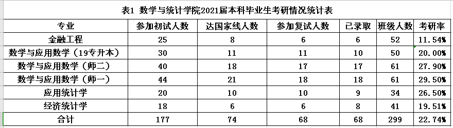 本网讯 在近期刚刚落下帷幕的2021届研究生考试中,太阳成集团122ccvip学子考研喜获佳绩、再创新高。全院共有74名毕业生初试通过国家线,68人成功考取研究生,考研率达22.74%。其中数学与应用数学(师范)、应用统计学、数学与应用数学(专升本)专业更是以28.68%、26.47%和20.00%的考研率刷新了专业考研率的历史新高。