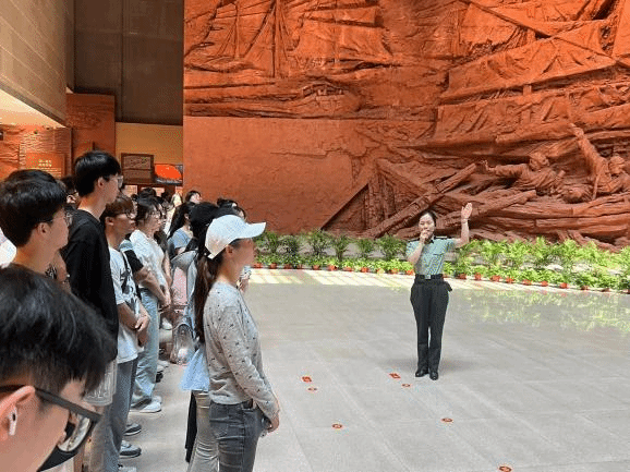 上午九点,同学们到达渡江战役纪念馆主场馆前,映入眼帘的是一只乘风破浪的“船头”和波光粼粼的“长江水”,五位战役总前委群雕以运筹帷幄之姿矗立在广场上,学习参观的全体党员在群雕前合影留念。