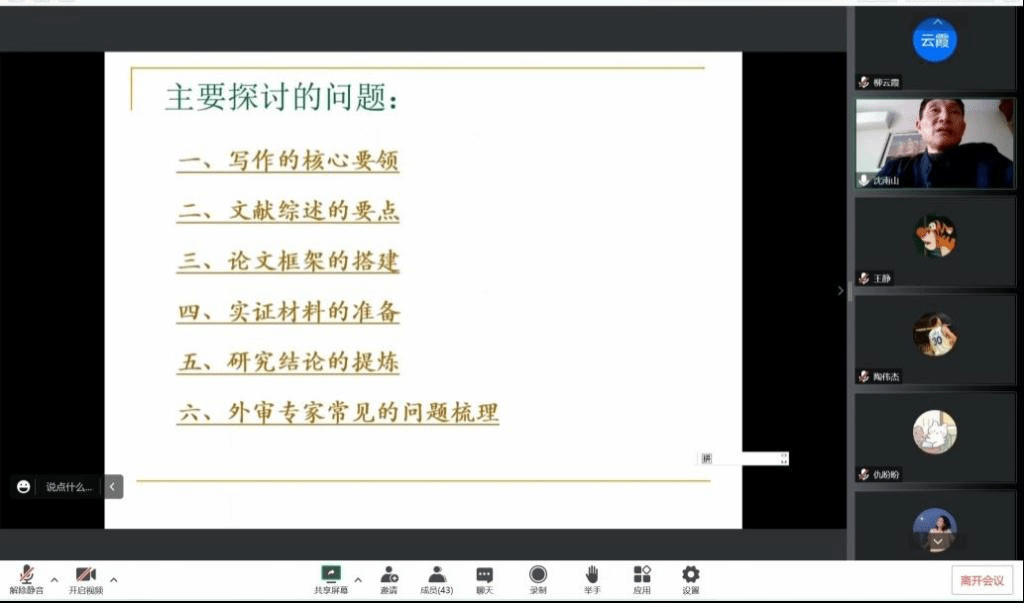针对数学教育硕士学位论文写作问题,沈南山老师讲了六个方面的内容:论文写作的核心要领、文献综述的要点、论文框架的搭建、实证材料的准备、研究结论的提炼以及外审专家常见的问题梳理等。且结合数学教育硕士培养方案,沈南山老师详细解读了硕士学位论文写作的基本方法,并提出若干建议。