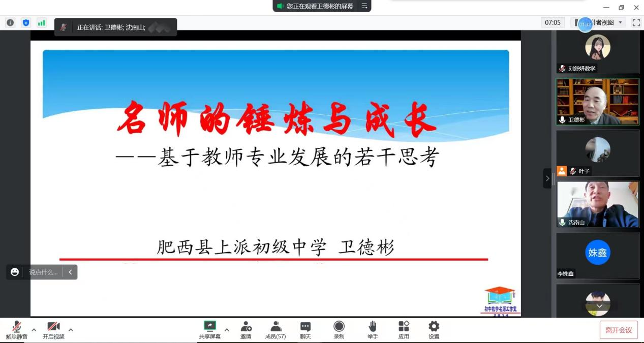 本网讯 2022年11月5日下午2:00,肥西县上派初级中学正高级教师卫德彬老师在线上为公司全体研究生作了题为《名师的锤炼与成长——基于教师专业发展的若干思考》的专题报告,报告持续2个小时,报告会由沈南山教授主持,公司部分教师和全体研究生参加了该报告会。