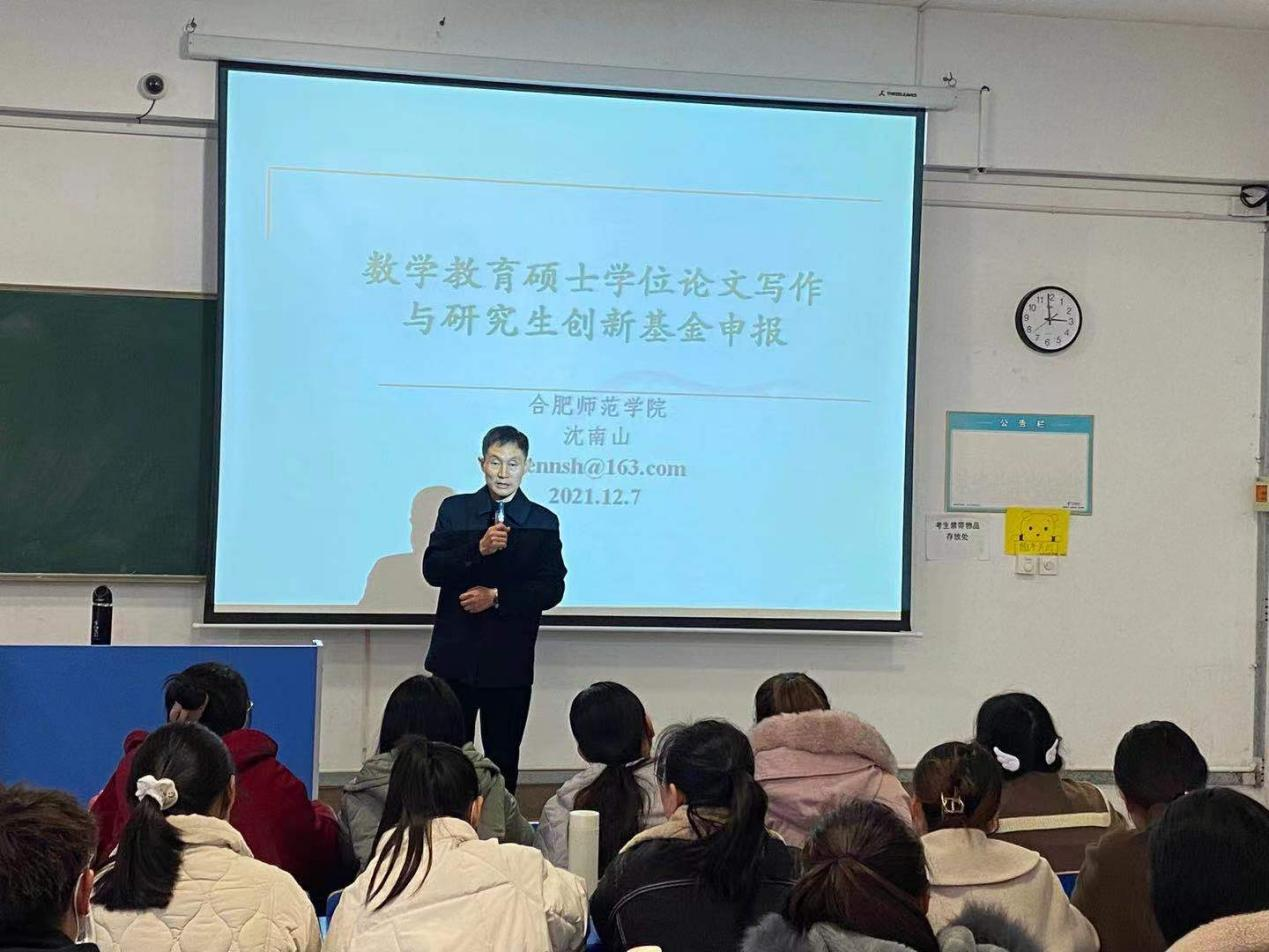 本网讯 2021年12月7日下午3时,太阳成集团122ccvip沈南山教授在锦绣校区逸夫楼A109教室作了题为“数学教育硕士学位论文写作与研究生创新基金申报”的专题报告,2021级数学学科教学专业全体研究生聆听了报告。