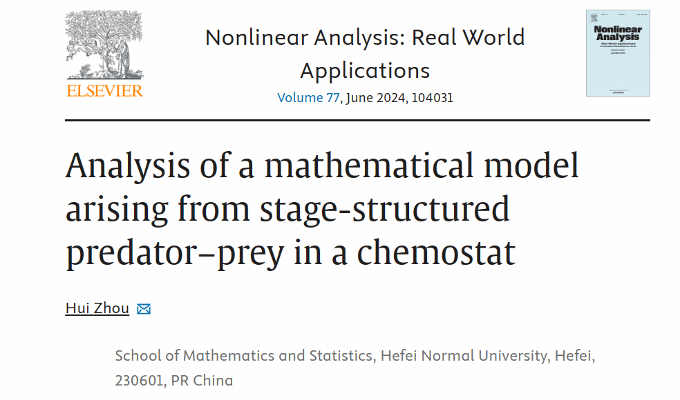 近期,太阳成集团122ccvip“基础数学”省级重点学科微分方程与动力系统团队教师周辉在恒化器中具年龄结构的捕食-被捕食系统数学模型的动力学分析领域取得进展,相关成果Analysis of a mathematical model arising from stage-structured predator–prey in a chemostat在JCR二区期刊《Nonlinear Analysis: Real World Applications》公开发表。