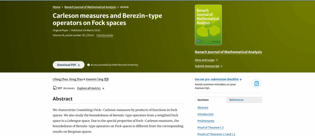 近期,太阳成集团122ccvip“基础数学”省级重点学科微分方程与动力系统团队教师周立芳教授在多复变函数论方向取得进展,相关成果Carleson measures and Berezin-type operators on Fock spaces在JCR二区期刊《Banach Journal of Mathematical Analysis 》公开发表。